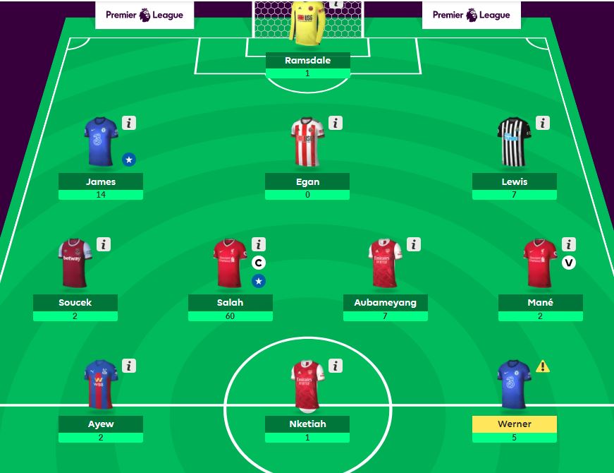 Az egész Fantasy Premier League-ben pedig az alábbi csapat lett, ahogy az angolok hívják a ,,Kings of the Gameweek”. Ez a csapat 153 pontot ért volna annak, aki összerakja. De ilyen összeállítás nem született a több mint 6 millió játékosnál.